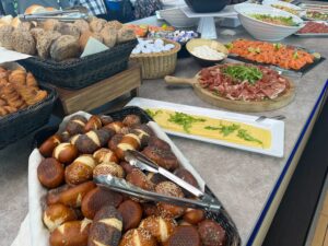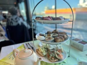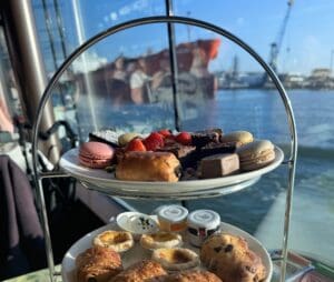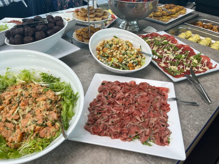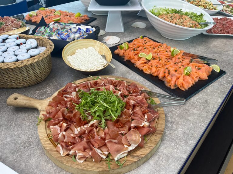 Aan boord verwelkomen we je met koffie/thee en een appelgebak met/zonder slagroom. Terwijl je ontspant, serveert ons keukenteam een heerlijke buffetlunch.