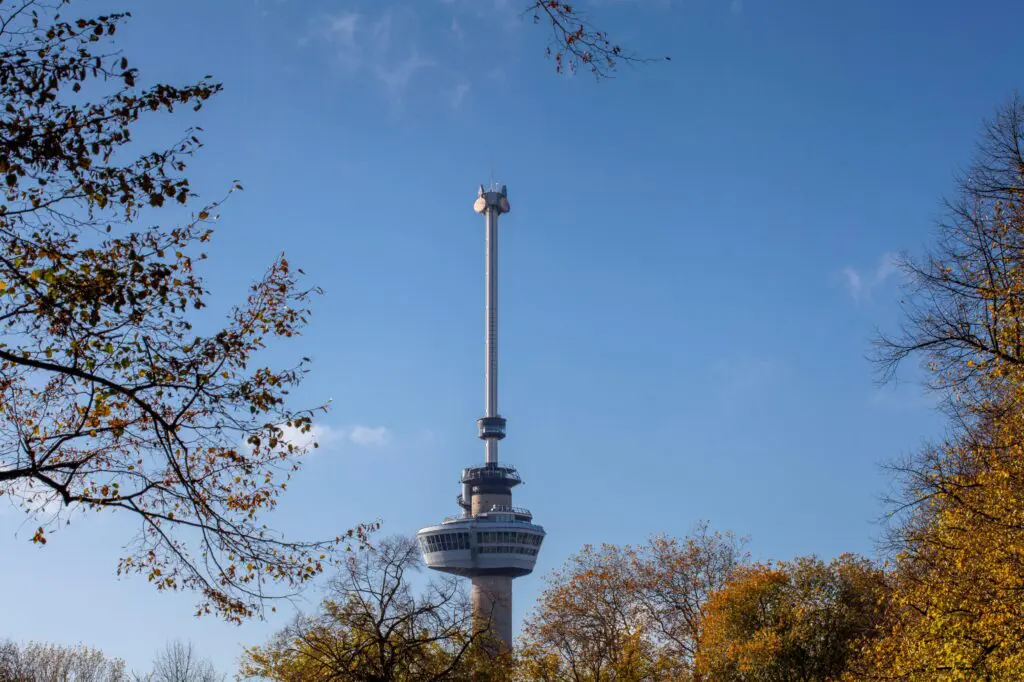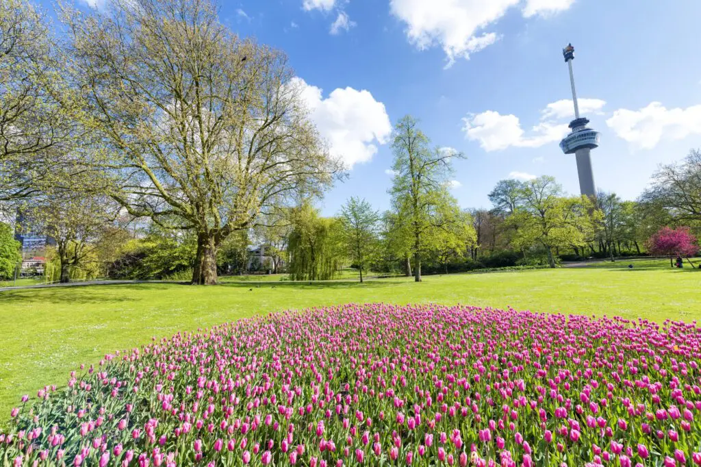 Ook het Park bij de Euromast is een populaire plek in de lente. Het is een klassiek stadspark vol bloemen, grote bomen en rustige wandelpaden. Vanaf hier wandel je makkelijk naar de kade van de Maas, waar de stad in beweging komt: schepen varen voorbij, fietsers rijden langs het water en het uitzicht op de skyline is indrukwekkend.