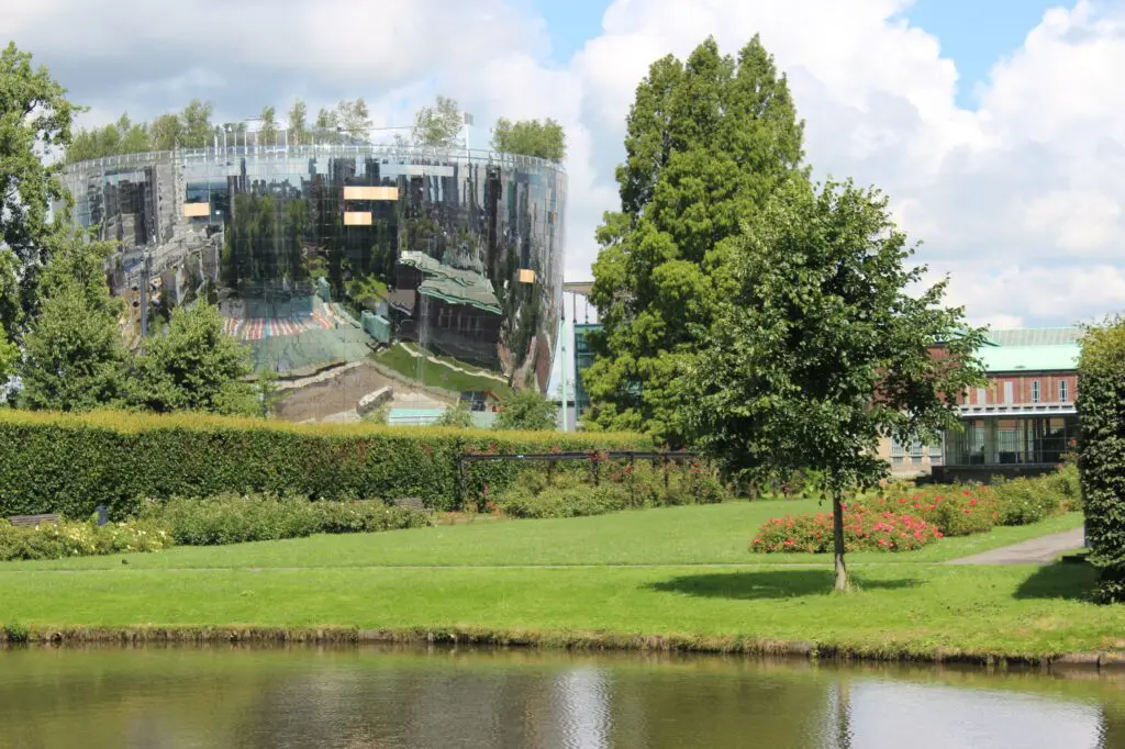 Een goed begin is het Museumpark, waar kunst en natuur elkaar ontmoeten. Tussen de musea door liggen grasvelden, vijvers en bloeiende bomen. Mensen lunchen in het zonnetje of wandelen richting het Depot Boijmans Van Beuningen, waarvan de spiegelende gevel het frisse licht weerkaatst.